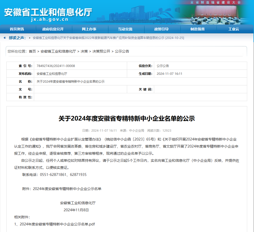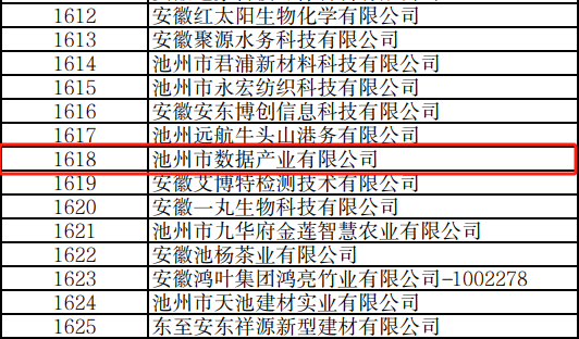 近日安徽省工業(yè)和信息化廳發(fā)布了2024年度專精特新中小企業(yè)公示名單集團所屬池州市數據產業(yè)有限公司榮獲2024年度安徽省“專精特新”中小企業(yè)。