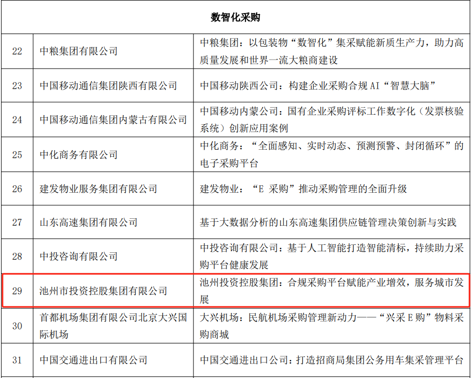 近日,中國物流與采購聯合會公共采購分會面向國企采購領域征集優(yōu)秀案例活動公布了評審結果,池州市投資控股集團有限公司合規(guī)采購平臺以“合規(guī)采購平臺賦能產業(yè)增效,服務城市發(fā)展”為題,獲評2024年度全國公共采購數智化采購優(yōu)秀案例。