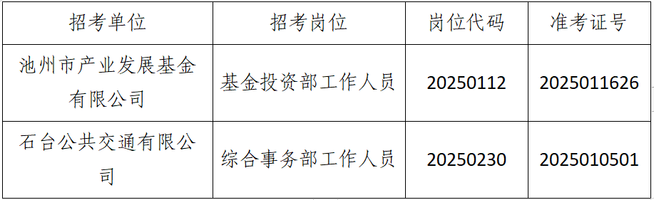 根據(jù)《池州市投資控股集團2025年公開招聘工作人員公告》要求,由于入圍現(xiàn)場資格復(fù)審的考生中有部分人員自動放棄或不合格產(chǎn)生了人員空缺,現(xiàn)按《公告》要求,在報考同崗位的考生中按筆試成績從高分到低分的順序依次遞補,成績出現(xiàn)并列者一并進入資格復(fù)審,現(xiàn)將入圍遞補資格復(fù)審情況公告如下: