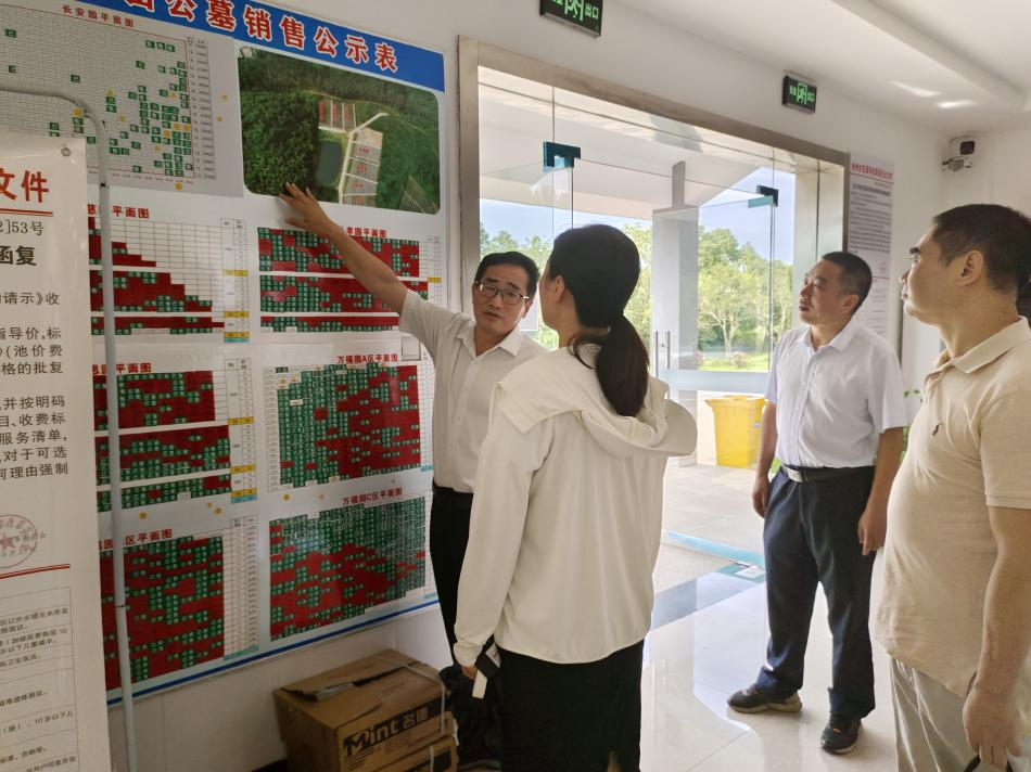 朱蕓蕓一行先后參觀了生態(tài)人文公司服務(wù)接待大廳、公墓銷售公示欄,聽取了生態(tài)人文公司目前安全生產(chǎn)、服務(wù)經(jīng)營等方面工作匯報,并實地察看了池州生態(tài)人文紀(jì)念園項目施工現(xiàn)場,深入了解了園區(qū)規(guī)劃、公益性墓區(qū)、骨灰堂等工程建設(shè)相關(guān)情況。
