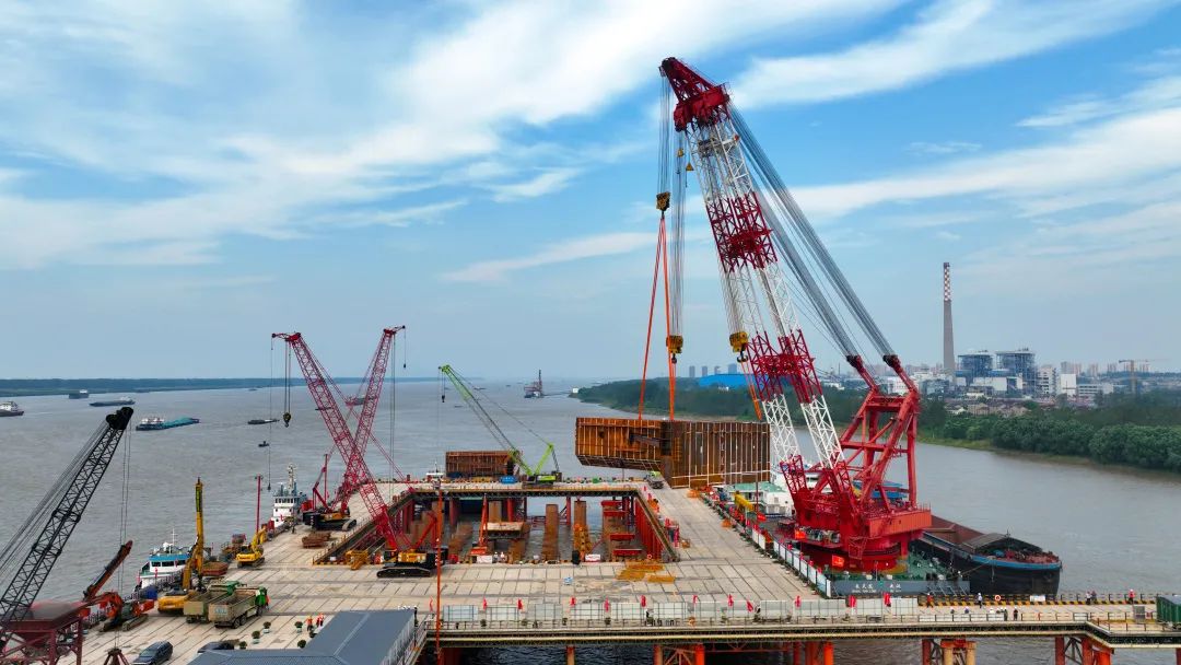 9月4日18時(shí),在距離池州岸約400米的長江江面施工現(xiàn)場,隨著一艘1000噸級吊船平穩(wěn)地將底節(jié)最后一吊鋼圍堰準(zhǔn)確下放到位,標(biāo)志著中鐵大橋局承建的集團(tuán)“頭號工程”池州長江公鐵大橋南主塔墩(4號墩)大橋南主墩建設(shè)率先轉(zhuǎn)入圍堰施工階段。