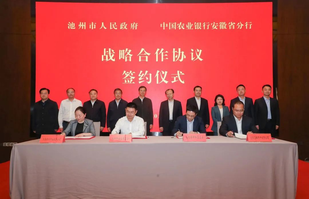 10月12日下午,池州市政府與中國農(nóng)業(yè)銀行安徽省分行舉行戰(zhàn)略合作協(xié)議簽約儀式。簽約儀式上,池州市政府與中國農(nóng)業(yè)銀行安徽省分行簽訂《戰(zhàn)略合作協(xié)議》;集團旗下產(chǎn)業(yè)發(fā)展基金有限公司、農(nóng)銀金融資產(chǎn)投資有限公司、合肥博軒私募基金管理有限公司、安徽江南新興產(chǎn)業(yè)投資有限公司共同簽訂《農(nóng)銀國軒新材料基金合作框架協(xié)議》。