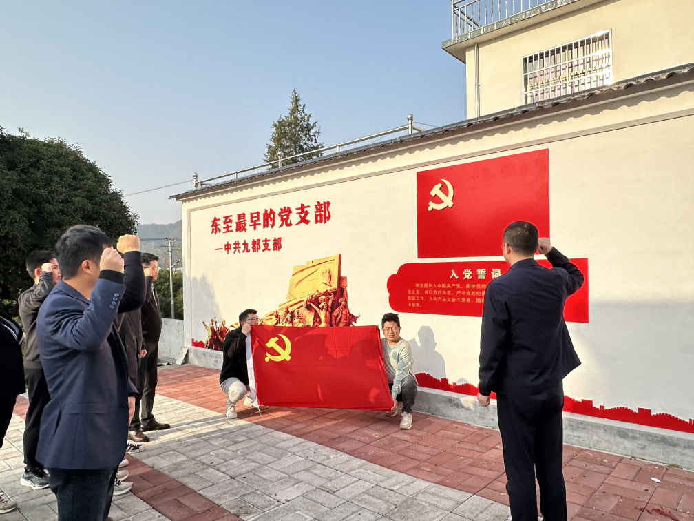 在活動(dòng)中兩支部的同志藏參觀了中共九都支部紀(jì)念館、胡炳炎故居,在這里大家受到了深刻的思想教育和精神洗禮。隨后全體黨員同志在廣場(chǎng)面向黨旗、高舉右拳,莊嚴(yán)宣誓。黨員同志們通過(guò)重溫入黨誓詞,回顧申請(qǐng)入黨時(shí)的滿腔熱血和堅(jiān)定決心。提醒自己時(shí)刻牢記誓言,終身踐行誓言。