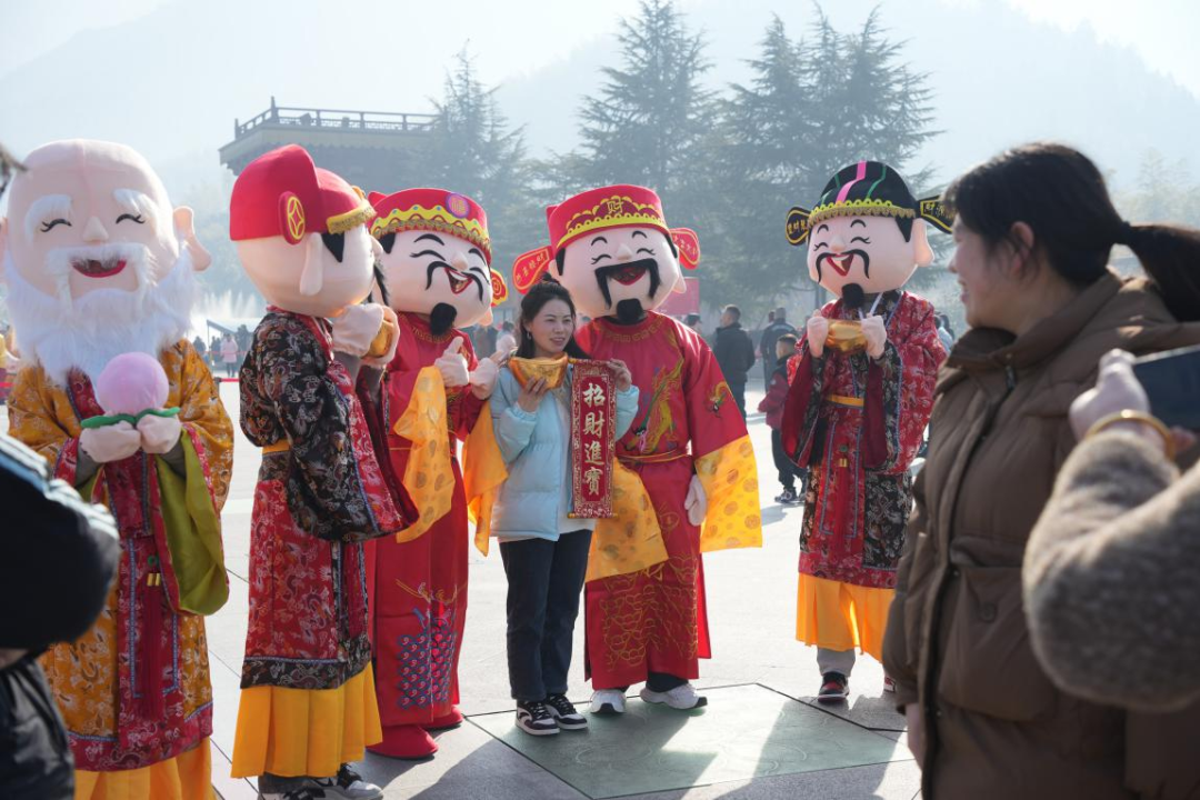 五路財(cái)神送祝福。新春佳節(jié)期間,分別在景區(qū)內(nèi)設(shè)有“福、祿、壽、喜、財(cái)”五個(gè)送福打卡點(diǎn),吉祥物們不定時(shí)在園區(qū)巡游,并為游客朋友們送上真摯的龍年祝福。大小朋友們也是追著福星排隊(duì)拍照打卡,現(xiàn)場呈現(xiàn)出一片人潮涌動(dòng)的祥和景象。