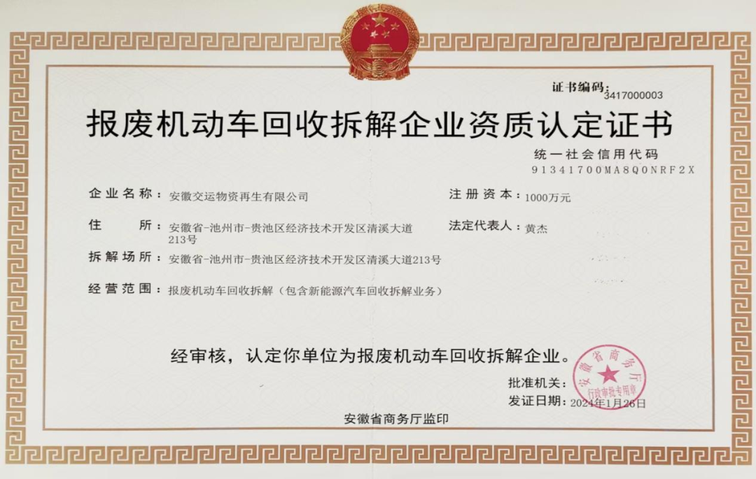 近日,集團所屬安徽交運物資再生有限公司順利通過安徽省商務(wù)廳批準(zhǔn),成功獲得報廢機動車回收拆解企業(yè)資質(zhì)認(rèn)定證書 。