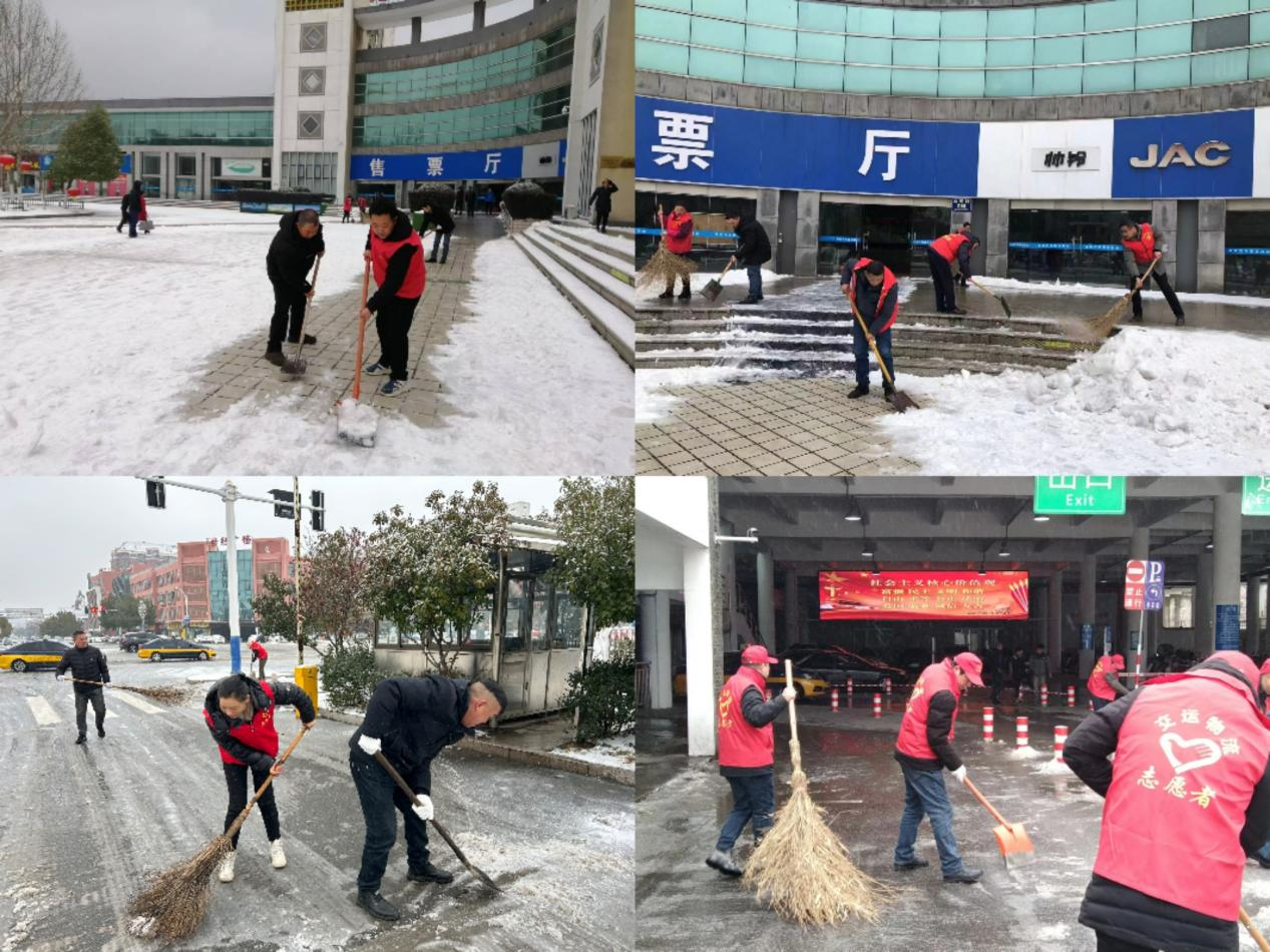 在池州的城市主干道、交通站場(chǎng)的周邊、公交站臺(tái)以及首末站有這樣一群身影,他們顧不上欣賞眼前難得一見的雪景,個(gè)個(gè)身披紅馬褂、有的胸前還佩戴黨徽,他們時(shí)而用鐵鍬在鏟、時(shí)而用掃帚在清理,他們整齊劃一都有一個(gè)共同的目標(biāo),就是盡快將路面積雪清除干凈。