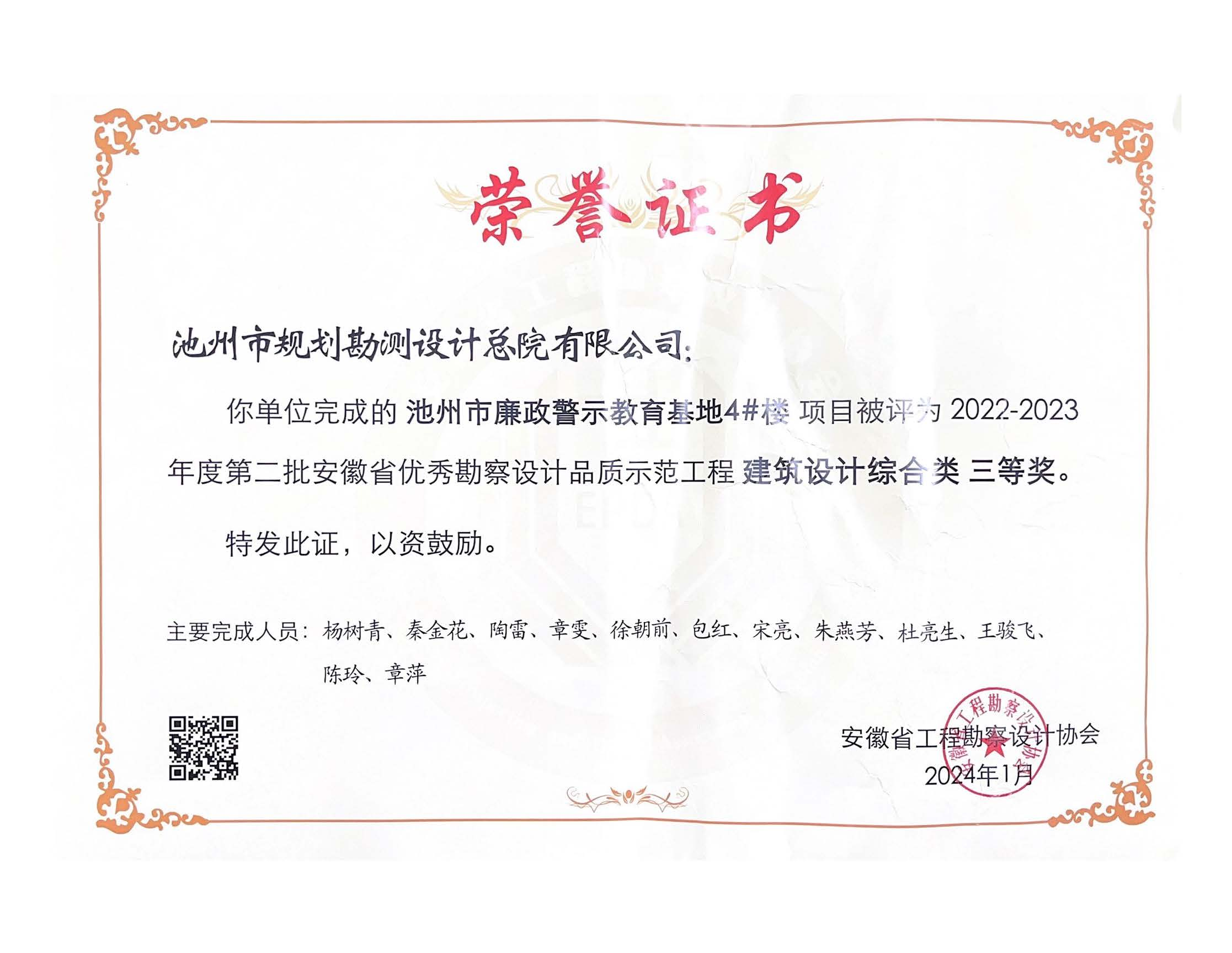 近日,2022-2023年度第二批安徽省優(yōu)秀勘察設(shè)計(jì)品質(zhì)示范工程名單公布,池州市規(guī)劃勘測設(shè)計(jì)總院有限公司憑借“池州市廉政警示教育基地4#樓設(shè)計(jì)項(xiàng)目”榮獲建筑設(shè)計(jì)綜合類三等獎(jiǎng)。