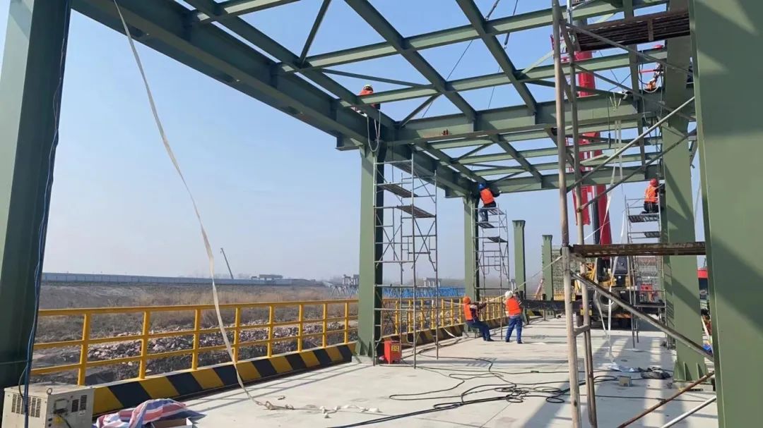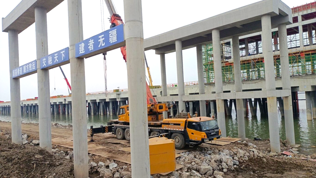 截至目前,項目水域部分碼頭平臺面層、兩座汽車引橋已全部澆筑完成,項目整體進度已完成約83%,碼頭工程主體結構與房建工程主體結構已全部施工完成,正在進行碼頭前沿鋼結構安裝、裝船機焊接打磨進行拼焊、房建工程進行內(nèi)部砌墻、鋼引橋吊裝、水域部分進行系纜欄桿安裝、橡膠護舷安裝、鋼軌安裝。碼頭陸域部分已進場工作,臨時道路及部分場地硬化已完成,正在進行B2轉(zhuǎn)運樓及管理用房區(qū)域內(nèi)基礎施工,水泥攪拌樁已開展工作。