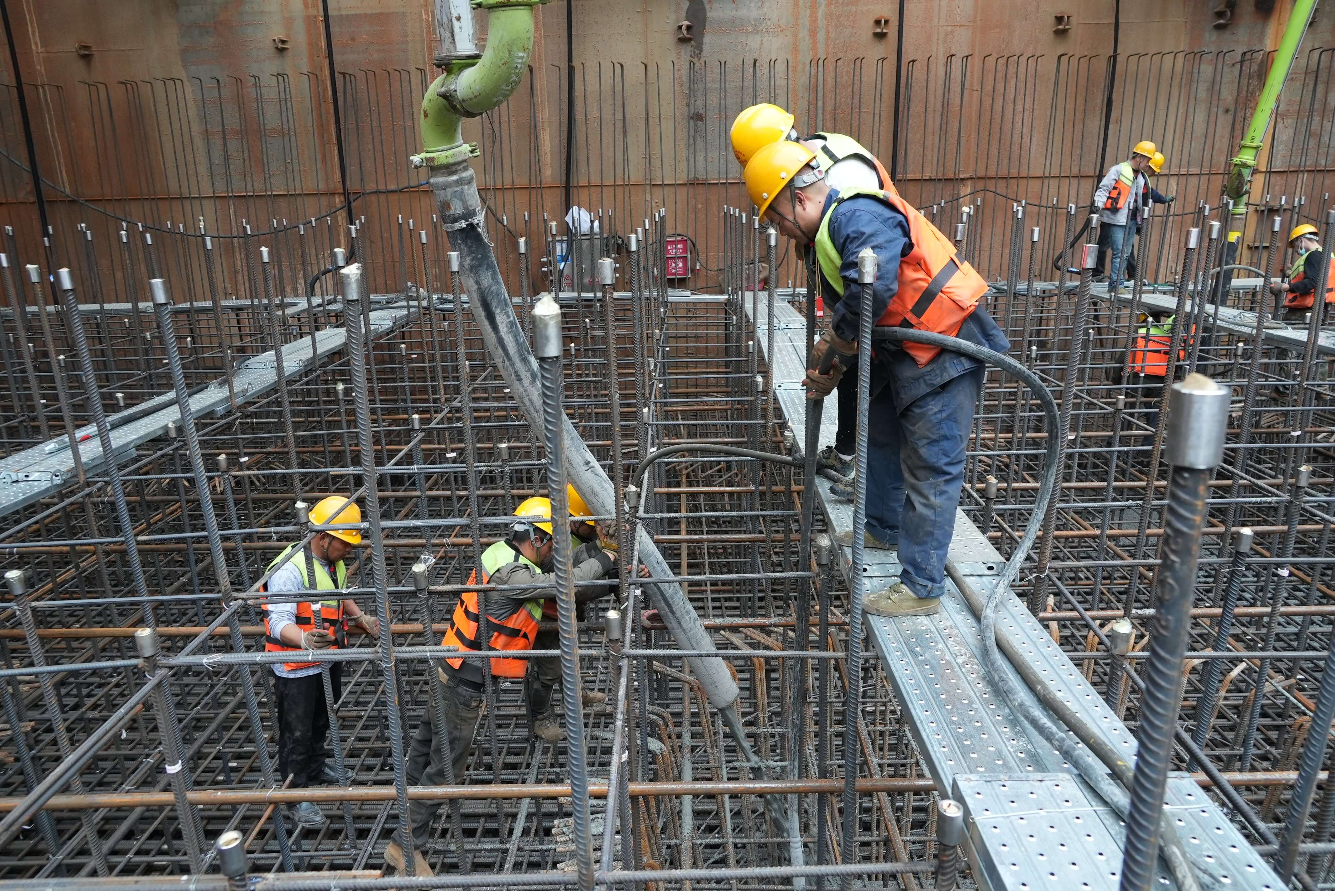 據(jù)施工單位池州長江公鐵大橋4號墩現(xiàn)場負責人介紹,此次澆筑的混凝土體量龐大,澆筑施工過程可能出現(xiàn)混凝土溫度急劇升高等技術難題,為此,各參建單位集思廣益,超前謀劃,“多管”齊下。一是措施詳細化,在施工前會同武漢理工大學對承臺溫控施工方案進行研究編制;二是布局提前化,在承臺施工過程中預埋冷卻水管,待混凝土澆注后,即可通過水管內循環(huán)流動的冷卻水對混凝土進行冷卻降溫;三是過程信息化,在承臺預先設置了溫控點,安裝測溫元件,在承臺冷卻階段,各溫控點將實時監(jiān)測混凝土溫度,并將相關數(shù)據(jù)反饋至項目部信息化處理中心,項目部可以精準把控承臺整體溫度情況,隨時調整冷卻水管中水流速度,避免出現(xiàn)大體積混凝土因散熱不均產生質量問題。