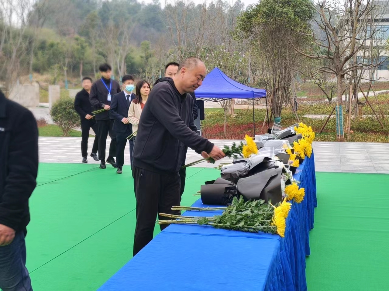 上午9時,集體公祭活動正式開始。現(xiàn)場樂聲低徊,莊重簡樸,參加儀式人員身著深色服飾,在展臺處莊嚴(yán)肅立。在集體公祭環(huán)節(jié),全體人員集體默哀,隨后手持鮮花拾階而上敬獻(xiàn)祈愿,面向公墓行鞠躬禮,表達(dá)對逝去人的追憶和緬懷。