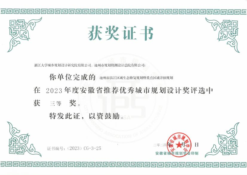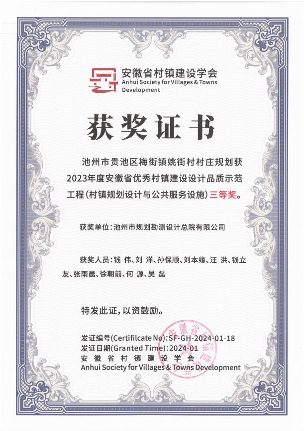 近日,安徽省村鎮(zhèn)建設(shè)學(xué)會(huì)和安徽省城市規(guī)劃學(xué)會(huì)分別揭曉了2023年度安徽省優(yōu)秀村鎮(zhèn)建設(shè)設(shè)計(jì)品質(zhì)示范工程和2023年度安徽省推薦優(yōu)秀城市規(guī)劃設(shè)計(jì)獎(jiǎng)的獲獎(jiǎng)名單。由集團(tuán)所屬設(shè)計(jì)總院公司編制完成的《池州市貴池區(qū)梅街鎮(zhèn)姚街村村莊規(guī)劃》和《池州市濱江區(qū)域生態(tài)修復(fù)規(guī)劃暨重點(diǎn)區(qū)域詳細(xì)規(guī)劃》兩個(gè)項(xiàng)目分別榮獲2023年度安徽省優(yōu)秀村鎮(zhèn)建設(shè)設(shè)計(jì)品質(zhì)示范工程(村鎮(zhèn)規(guī)劃設(shè)計(jì)與公共服務(wù)設(shè)施)三等獎(jiǎng)和2023年度安徽省推薦優(yōu)秀城市規(guī)劃設(shè)計(jì)獎(jiǎng)三等獎(jiǎng)。