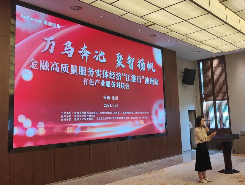 本次會(huì)議由池州市經(jīng)濟(jì)信息化局、池州市財(cái)政局(國(guó)資委)、池州市商務(wù)局、安糧期貨股份有限公司主辦,池州市投資控股集團(tuán)協(xié)辦,安徽友進(jìn)冠華新材料科技股份有限公司、池州建投商業(yè)發(fā)展有限公司提供支持,邀請(qǐng)了池州市鎂鋁銅相關(guān)企業(yè)及多家金融機(jī)構(gòu)代表參會(huì)。池州市商務(wù)局黨組書(shū)記、局長(zhǎng)李進(jìn)出席活動(dòng),池州市經(jīng)濟(jì)與信息化局副局長(zhǎng)朱宇、安糧期貨董事長(zhǎng)韓文輝先后致辭。