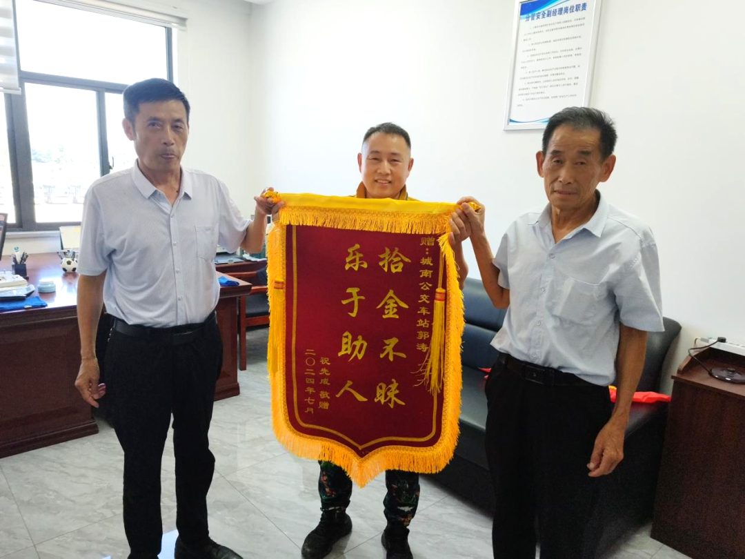 7月4日下午,東至縣木塔鄉(xiāng)居民祝先生將一面寫有“拾金不昧 樂于助人”的錦旗送到了東至公共交通有限公司,以此向擔(dān)任縣城至利安木塔駕駛員郭濤師傅表示感謝。據(jù)了解,祝先生于3日下午乘坐縣城至利安木塔最后一班公交車回家,不慎將自己的錢包掉落在公交車上。車到目的地后,郭師傅在打掃公交車衛(wèi)生時,發(fā)現(xiàn)乘客遺落的錢包,通過查看,包內(nèi)有身份證、醫(yī)療卡、銀行卡等證件和現(xiàn)金1200元。郭師傅擔(dān)心失主著急,通過身份證,輾轉(zhuǎn)找到熟悉的朋友,后又由朋友找到祝先生所在村村書記。通過村書記聯(lián)系到失主本人。在祝先生當(dāng)面表示感謝時,郭師傅表示,“這都是自己應(yīng)該做的。”