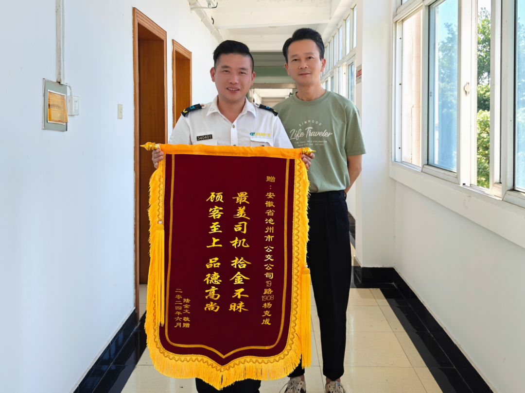 6月25日下午,池州市城市公共交通有限公司收到了乘客陸先生從河北郵寄來的一面錦旗。6月23日早上7:40分,城市公交客服熱線接到了乘客陸先生打來的電話,陸先生表示自己的手機(jī)和身份證丟了,半小時前乘坐過19路公交車。調(diào)度員在了解情況后立刻通過調(diào)度系統(tǒng)鎖定車輛并聯(lián)系公交師傅。楊克成師傅在靠站后找到了一個手機(jī)和一個身份證,立刻拍照發(fā)給調(diào)度中心進(jìn)行了核實(shí),并對物品進(jìn)行了保管。上午10:30分,陸先生在1908車楊克成師傅手上接過了自己遺失的手機(jī)和身份證,激動萬分,表示手機(jī)里的文件非常重要,能夠這么快完好無損的找回來自己很開心,非常感謝楊師傅。楊師傅表示“拾金不昧,物歸原主”是自己作為駕駛員應(yīng)該做的,哪怕是一根針一根線我們找到了都會保管好還給乘客。